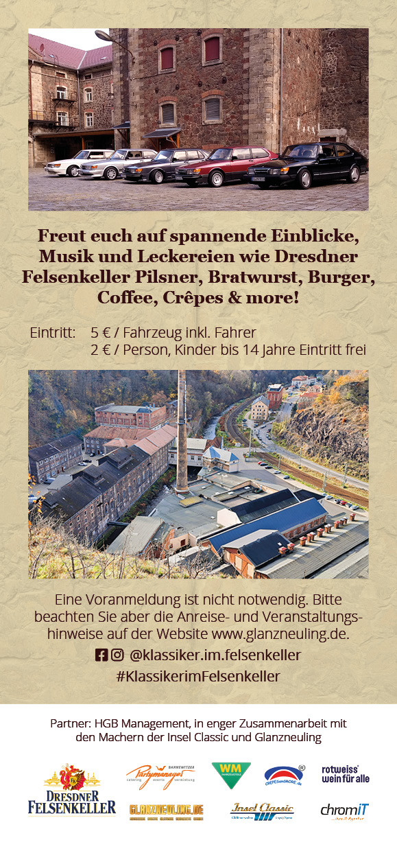 Veranstaltungs-Hinweise: Die Einfahrt auf das Felsenkeller-Event-Gelände ist nur für historische Fahrzeuge (PKW, Krad, Moped) bis zum Baujahr 1996 ab 10:00 Uhr möglich.
