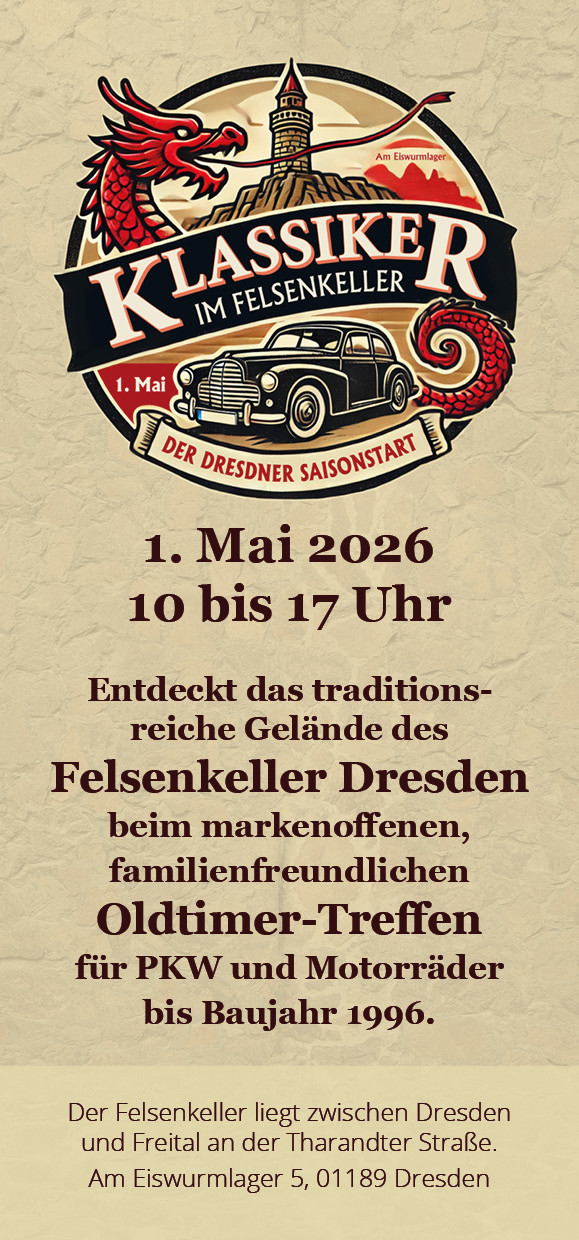 Entdecke das traditionsreiche Gelände des Felsenkeller Dresden beim markenoffenen, familienfreundlichen Oldtimer-Treffen für PKW und Motorräder bis Baujahr 1996. Bitte beachte die Veranstaltungshinweise am unteren Ende der Website!